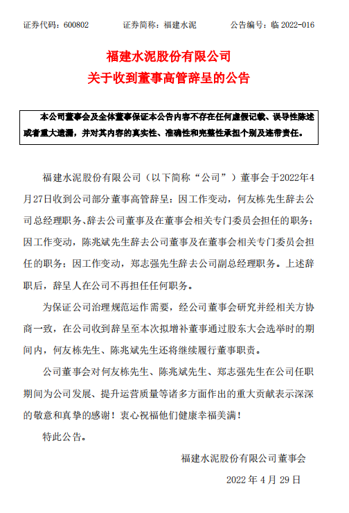同日公告稱,福建水泥股份有限公司董事會(huì)于2022年4月27日收到公司部分董事高管辭呈:因工作變動(dòng),何友棟先生辭去公司總經(jīng)理職務(wù)、辭去公司董事及在董事會(huì)相關(guān)專門(mén)委員會(huì)擔(dān)任的職務(wù);因工作變動(dòng),陳兆斌先生辭去公司董事及在董事會(huì)相關(guān)專門(mén)委員會(huì)擔(dān)任的職務(wù);因工作變動(dòng),鄭志強(qiáng)先生辭去公司副總經(jīng)理職務(wù)。辭呈人在公司不再擔(dān)任任何職務(wù)。