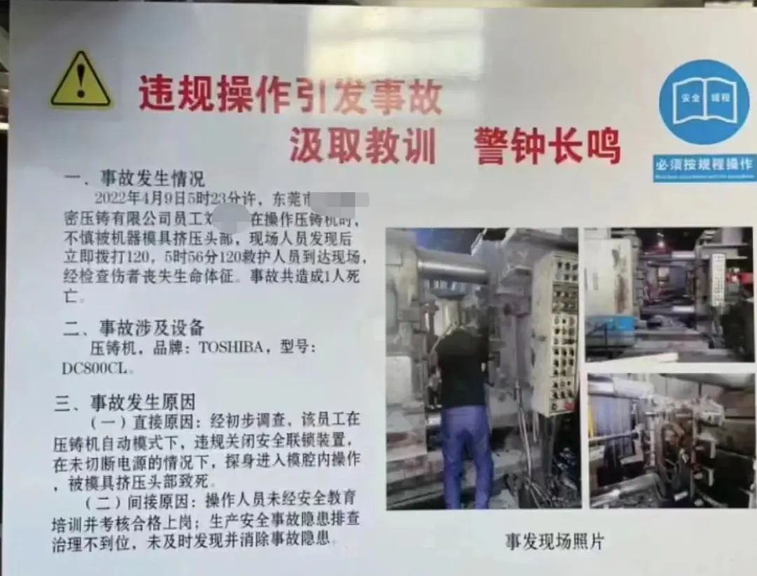 2022年4月9日5時23分許,東莞市某精密壓鑄有限公司員工劉某在操作壓鑄機時,不慎被機器模具擠壓頭部,現(xiàn)場人員發(fā)現(xiàn)后立即撥打120,5時56分120救護人員到達現(xiàn)場,經(jīng)檢查傷者喪失生命體征。