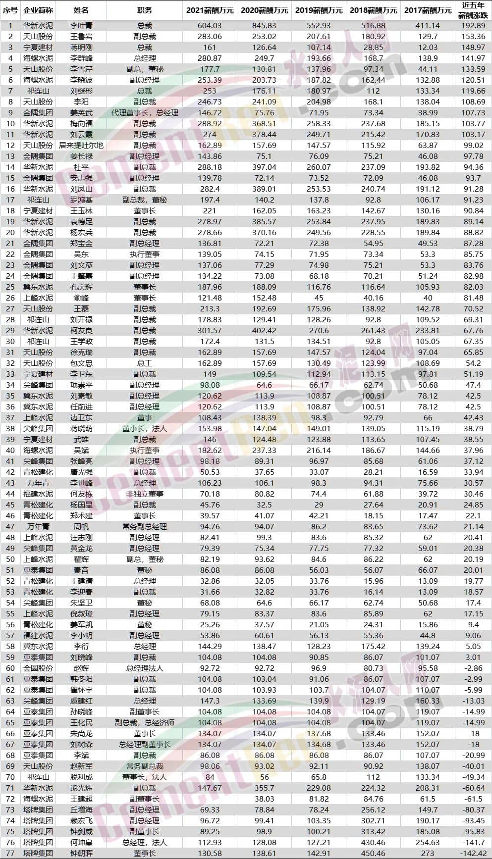 水泥行業(yè)77位高管薪酬,前五年漲多降少