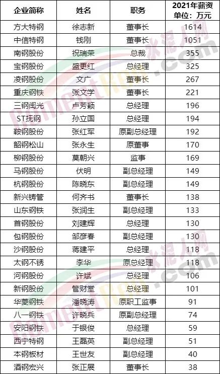 各上市鋼企2021年薪酬最高的高管明細(xì)