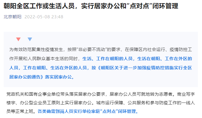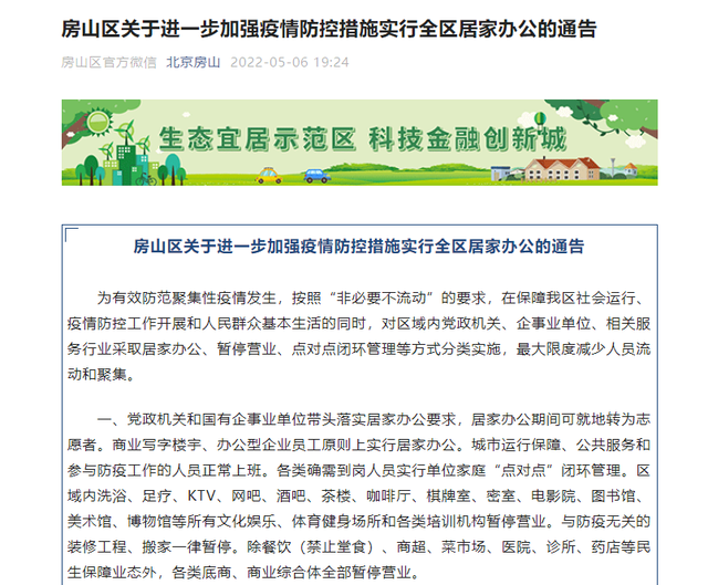 房山區(qū)發(fā)布了進一步加強疫情防控措施實行全區(qū)居家辦公的通告,商業(yè)寫字樓宇、辦公型企業(yè)員工原則上實行居家辦公,各類確需到崗人員實行單位家庭“點對點”閉環(huán)管理。