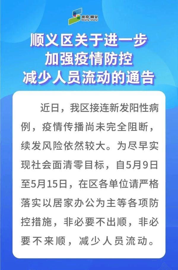 自5月9日至5月15日,順義區(qū)各單位嚴(yán)格落實以居家辦公為主的各項防控措施,非必要不出順,非必要不來順,減少人員流動。通告要求,居住在朝陽區(qū)和房山區(qū)、工作在順義區(qū),或居住在順義區(qū)、工作在朝陽區(qū)、房山區(qū)的人員,一律居家辦公;各單位確需到崗的,將上崗率嚴(yán)格控制在50%以內(nèi),實行單位-家庭“點對點”閉環(huán)出行方式為主,最大限度減少流動。