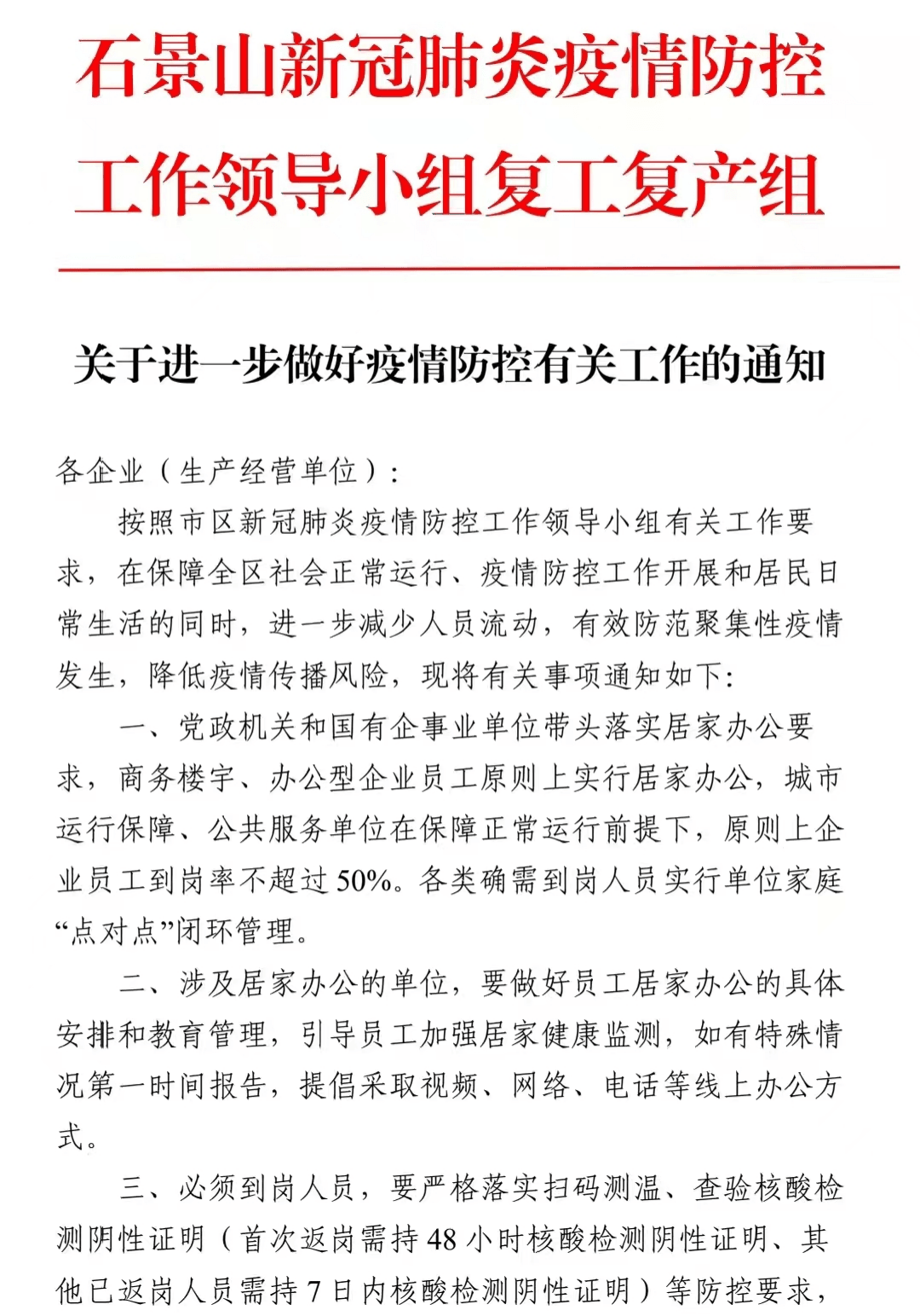 石景山區(qū)新冠肺炎疫情防控工作領(lǐng)導(dǎo)小組復(fù)工復(fù)產(chǎn)組發(fā)布《關(guān)于進一步做好疫情防控有關(guān)工作的通知》,要求黨政機關(guān)和國有企事業(yè)單位帶頭落實居家辦公要求,商務(wù)樓宇、辦公型企業(yè)員工原則上實行居家辦公,城市運行保障、公共服務(wù)單位在保障正常運行前提下,原則上企業(yè)員工到崗率不超過50%,各類確需到崗人員實行單位家庭“點對點”閉環(huán)管理。