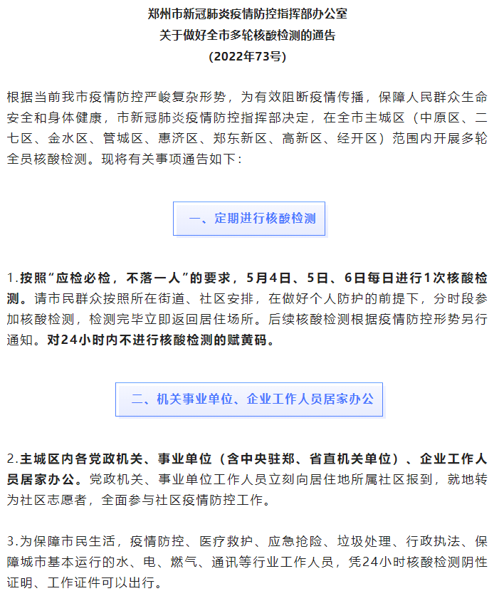 鄭州市新冠肺炎疫情防控指揮部辦公室發(fā)布73號通告,要求主城區(qū)內(nèi)各黨政機關(guān)、事業(yè)單位(含中央駐鄭、省直機關(guān)單位)、企業(yè)工作人員居家辦公。除保障市民生活和城市基本運行的公共服務(wù)類企業(yè)、經(jīng)審批符合閉環(huán)管理條件的企業(yè)外,其他各類企業(yè)暫停生產(chǎn)經(jīng)營活動。