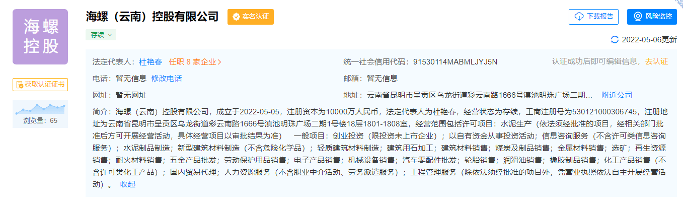 天眼查數(shù)據(jù)顯示,海螺(云南)控股有限公司成立于2022年5月5日,注冊(cè)資本1億元,法人代表為杜艷春,經(jīng)營(yíng)范圍包括:水泥生產(chǎn);創(chuàng)業(yè)投資(限投資未上市企業(yè));以自有資金從事投資活動(dòng);信息咨詢服務(wù)(不含許可類信息咨詢服務(wù))等。目前,其由海螺水泥100%持股。