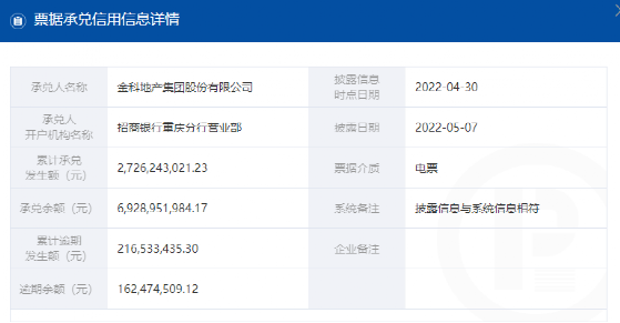 金科地產(chǎn)集團(tuán)股份有限公司依然在逾期名單之中,查詢金科地產(chǎn)4月末商票累計(jì)逾期金額達(dá)2.17億元,月末逾期余額為1.62億元,金額較3月有所擴(kuò)大。