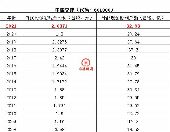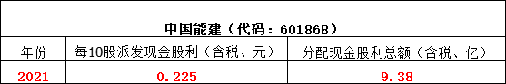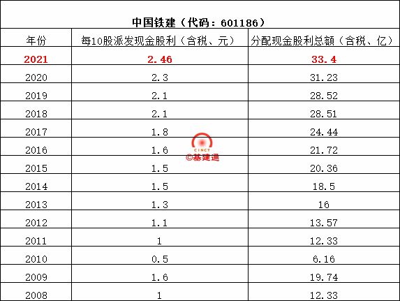 中國(guó)鐵建以2021年12月31日公司總股本13579541500股為基數(shù),每10股派送現(xiàn)金紅利2.46元(含稅),共計(jì)分配利潤(rùn)33.4億元,占當(dāng)年合并報(bào)表歸屬于上市公司普通股股東可供分配利潤(rùn)的15.37%。