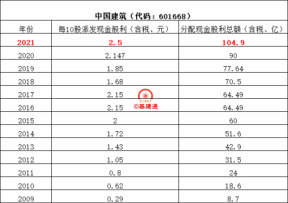 中國(guó)建筑2021年合并報(bào)表歸屬于上市公司股東凈利潤(rùn)為514.08億元,母公司累計(jì)未分配利潤(rùn)為 486.66億元,上市公司擬向全體股東每10股派發(fā)現(xiàn)金紅利2.5元(含稅)??偣杀?41940858844股,以此計(jì)算合計(jì)擬派發(fā)現(xiàn)金紅利約104.9億元(含稅)。本年度現(xiàn)金分紅占合并報(bào)表歸屬于母公司股東凈利潤(rùn)的比例為20.40%。