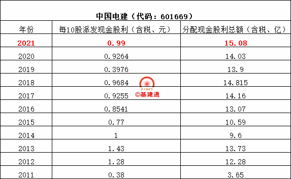 中國(guó)電建2021年度以期末總股本15299035024股,扣除回購(gòu)專(zhuān)戶(hù)股份152999901股為基數(shù),向全體股東每10股派發(fā)現(xiàn)金紅利0.9957元(含稅),共計(jì)分配現(xiàn)金股利15.08億元,占本年度末母公司可供股東分配利潤(rùn)的28.57%,占本年度合并會(huì)計(jì)報(bào)表歸屬于上市公司普通股股東凈利潤(rùn)的20%。