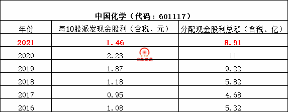 中國(guó)化學(xué)擬以2021年12月31日總股數(shù)6109470588股為基數(shù),向全體股東每10股派1.46元(含稅)現(xiàn)金股息,共派發(fā)現(xiàn)金股利8.91億元,擬分配的現(xiàn)金股息總額與當(dāng)年歸屬于上市公司股東的凈利潤(rùn)之比為20.01%。