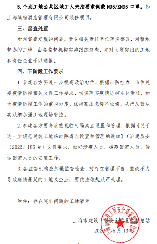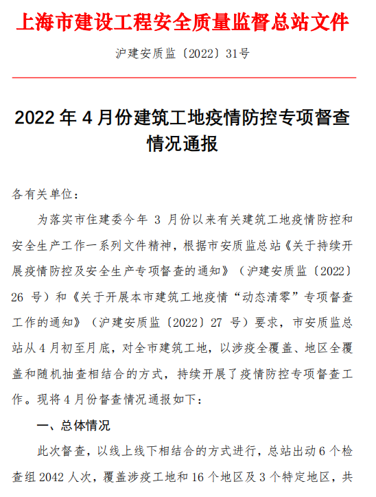 5月13日,上海市安質(zhì)監(jiān)總站發(fā)布《2022年4月份建筑工地疫情防控專項(xiàng)督查情況通報(bào)》稱,為落實(shí)市住建委3月份以來有關(guān)建筑工地疫情防控和安全生產(chǎn)工作一系列文件精神,根據(jù)相關(guān)文件要求,市安質(zhì)監(jiān)總站從4月初至月底,對全市建筑工地,以涉疫全覆蓋、地區(qū)全覆蓋和隨機(jī)抽查相結(jié)合的方式,持續(xù)開展了疫情防控專項(xiàng)督查工作。 此次督查,以線上線下相結(jié)合的方式進(jìn)行,總站出動6個(gè)檢查組2042人次,覆蓋涉疫工地和16個(gè)地區(qū)及3個(gè)特定地區(qū),共計(jì)督查工地971個(gè)次(含復(fù)查)。