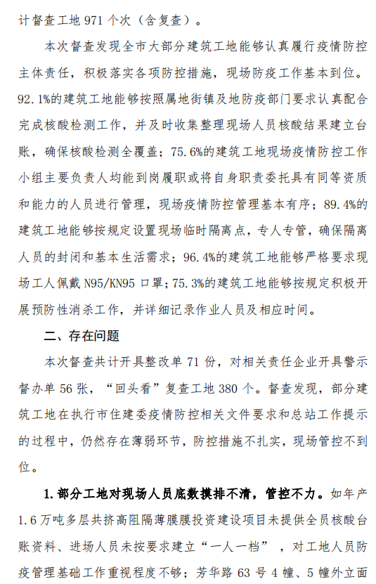 本次督查共計(jì)開具整改單71份,對相關(guān)責(zé)任企業(yè)開具警示督辦單56張,“回頭看”復(fù)查工地380個(gè)。督查發(fā)現(xiàn),部分建筑工地在執(zhí)行市住建委疫情防控相關(guān)文件要求和總站工作提示的過程中,仍然存在薄弱環(huán)節(jié),防控措施不扎實(shí),現(xiàn)場管控不到位。