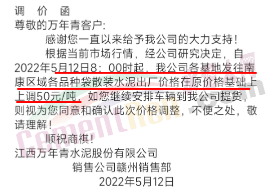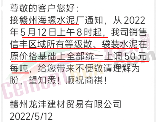 5月10日弋陽海螺水泥、江西萬年青,對上饒所有袋散水泥價(jià)格上調(diào)50元/噸。