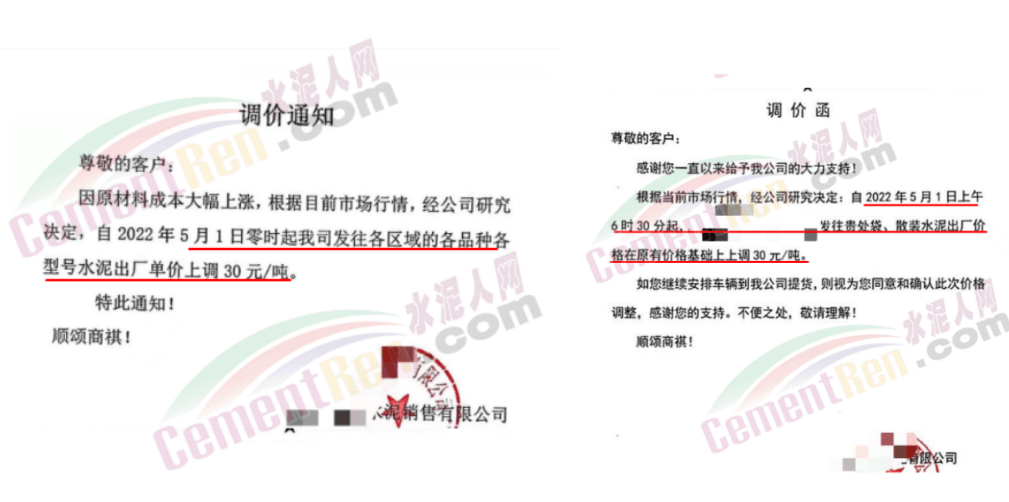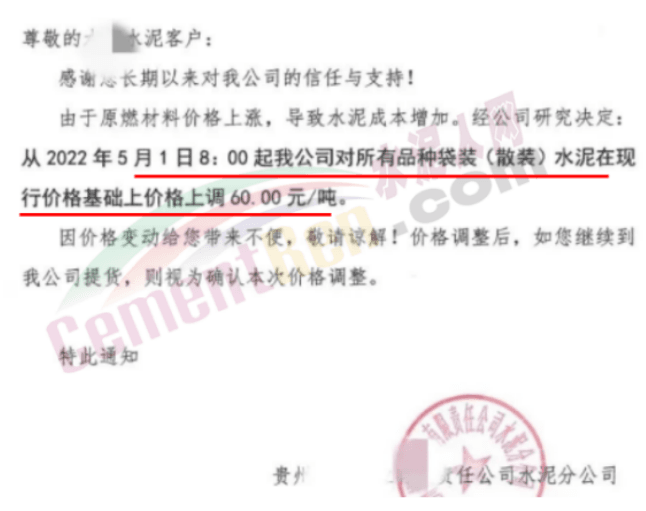 5月6日四川某水泥企業(yè)通知,對甘孜區(qū)域所有品種水泥出廠價(jià)上調(diào)30元/噸。