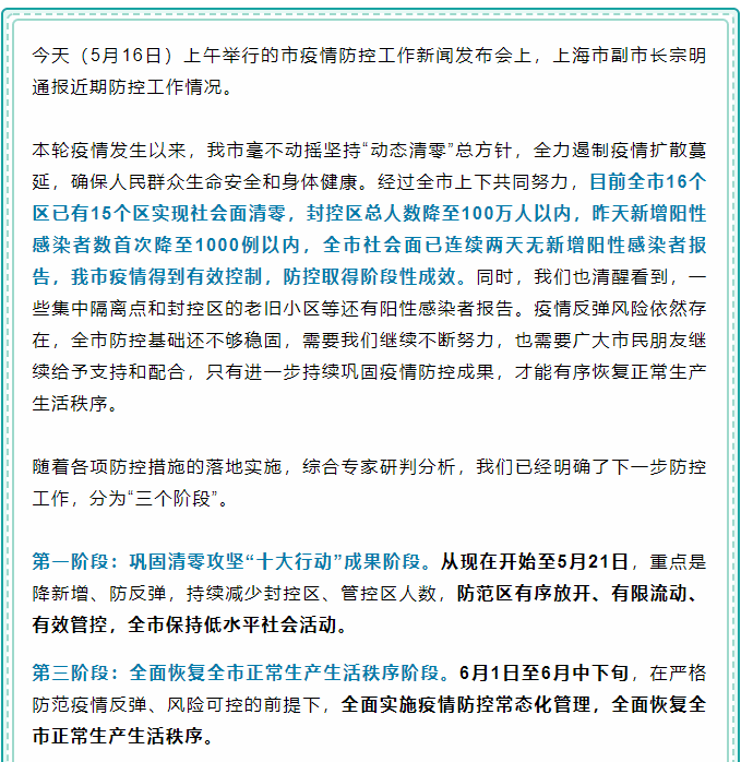 目前,上海已經(jīng)明確了下一步防控工作,分為“三個(gè)階段”。第一階段:鞏固清零攻堅(jiān)“十大行動(dòng)”成果階段。第二階段:向常態(tài)化防控轉(zhuǎn)換階段。第三階段:全面恢復(fù)全市正常生產(chǎn)生活秩序階段,并明確6月1日至6月中下旬,在嚴(yán)格防范疫情反彈、風(fēng)險(xiǎn)可控的前提下,全面實(shí)施疫情防控常態(tài)化管理,全面恢復(fù)全市正常生產(chǎn)生活秩序。
