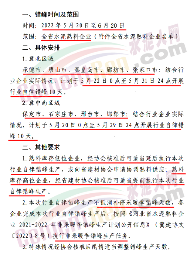5月15日,河北省建筑材料工業(yè)協(xié)會(huì)發(fā)布《關(guān)于河北省水泥熟料企業(yè)開展夏季行業(yè)自律錯(cuò)峰生產(chǎn)的預(yù)備通知》稱, 近期新冠疫情多點(diǎn)散發(fā)來勢(shì)洶洶,各地疫情防控嚴(yán)格,對(duì)建材行業(yè)生產(chǎn)經(jīng)營(yíng)造成巨大影響和波動(dòng),根據(jù)相關(guān)文件要求,全省水泥熟料企業(yè)于2022年5月20日至6月20日期間分區(qū)域開展夏季錯(cuò)峰。