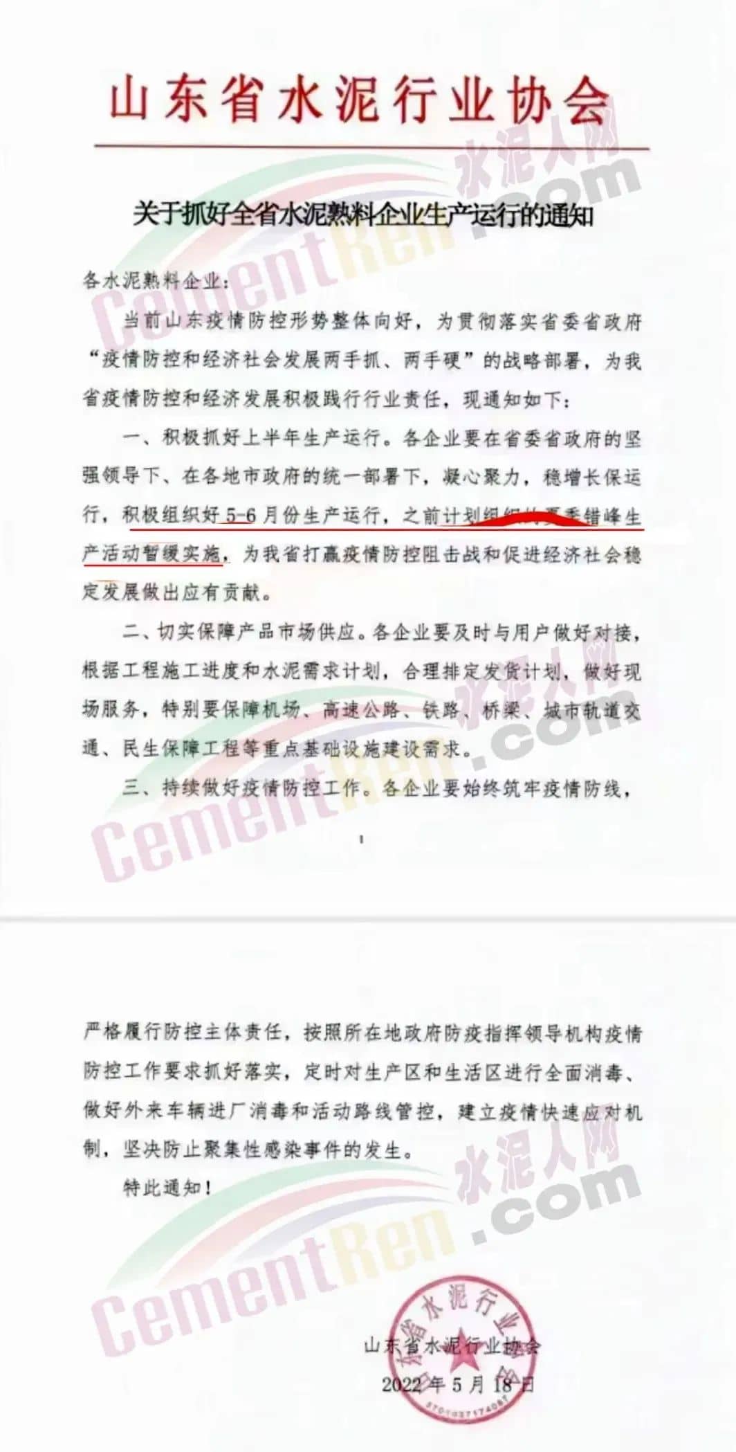 5月18日,山東省水泥行業(yè)協(xié)會(huì)發(fā)布《關(guān)于抓好全省水泥熟料企業(yè)生產(chǎn)運(yùn)行的通知》稱, 為積極抓好上半年生產(chǎn)運(yùn)行。各企業(yè)要在省委省政府的堅(jiān)強(qiáng)領(lǐng)導(dǎo)下、在各地市政府的統(tǒng)一部署下,凝心聚力,穩(wěn)增長保運(yùn)行,積極組織好5-6月份生產(chǎn)運(yùn)行,之前計(jì)劃組織的夏季錯(cuò)峰生產(chǎn)活動(dòng)暫緩實(shí)施,為山東省打贏疫情防控阻擊戰(zhàn)和促進(jìn)經(jīng)濟(jì)社會(huì)穩(wěn)定發(fā)展做出應(yīng)有貢獻(xiàn)。