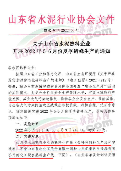 據(jù)水泥人網(wǎng)此前消息,本月11日山東省水泥協(xié)會(huì)剛剛發(fā)布了5月21日開啟夏季錯(cuò)峰的通知。