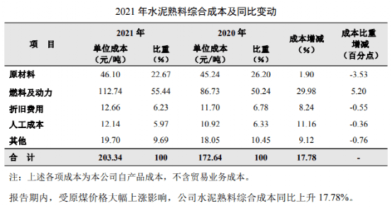 以海螺水泥為例,2021年燃料及動力成本占55.44%,原材料占比22.67%,折舊占比6.23%,人工成本及其它占比5.97%。報告期內,受原煤價格大幅上漲影響,公司水泥熟料綜合成本同比上升 17.78%。