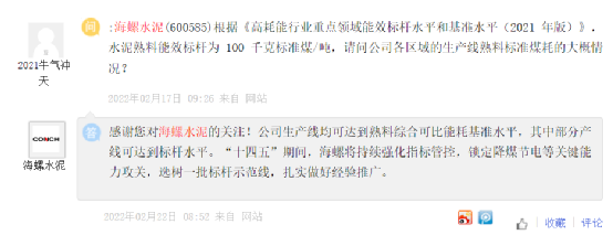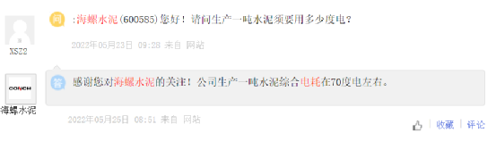 海螺水泥此前在回復投資者問題時曾表示公司生產線均可達到熟料綜合可比能耗基準水平,其中部分產線可達到標桿水平,公司生產一噸水泥綜合電耗在70度電左右。(熟料單位產品綜合能耗標桿水平為100千克標準煤/噸;基準水平為117千克標準煤/噸。)