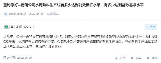 冀東水泥回復投資者時稱,近幾年,公司一直積極推進節(jié)能降耗工作,目前運行的熟料生產線有15%的能耗達到能耗標桿水平,預計到2023年末,比例還有大幅提升的空間;公司除個別將要進行產能置換的熟料生產線外,其他熟料生產線基本都能達到能耗基準水平,目前還在提升優(yōu)化。