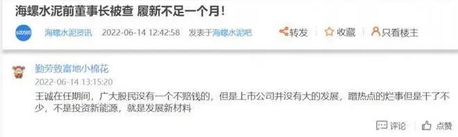 6月13日,海螺水泥前董事長王誠被查一事在網(wǎng)上發(fā)酵。海螺水泥股吧里的投資者議論紛紛,有股民抱怨,“王誠在任期間,廣大股民沒有一個不賠錢的,但是上市公司并沒有大的發(fā)展,蹭熱點的爛事倒是干了不少,不是投資新能源,就是發(fā)展新材料”,也有股民認為,此消息是“利空出盡”……