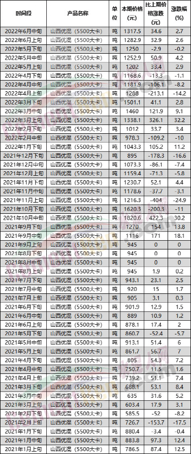 國(guó)家統(tǒng)計(jì)局最新公布的6月中旬流通領(lǐng)域山西優(yōu)混(5500大卡)煤炭市場(chǎng)價(jià)格為市場(chǎng)價(jià)格為1317.5元/噸,較上年同期889元/噸,上漲了428.5元/噸,漲幅48%。