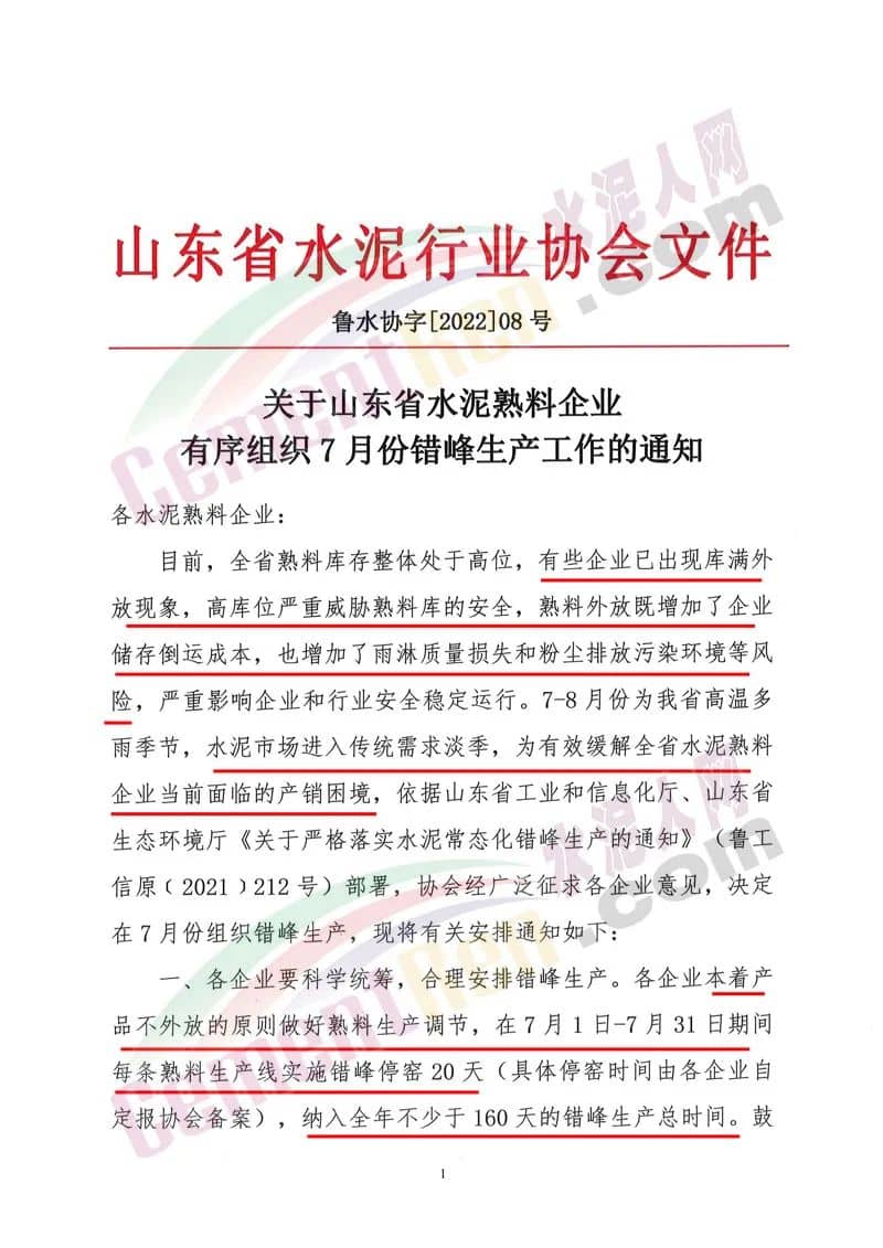 山東省水泥熟料生產(chǎn)線7月停產(chǎn)20天!