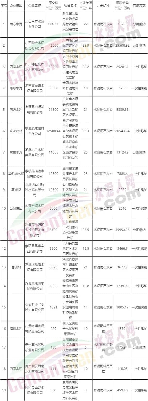 據(jù)水泥人網不完統(tǒng)計,近半年來國家自然資源部發(fā)布19條已經成交的水泥石灰?guī)r采礦權中最高成交價為江山南方水泥有限公司以114890萬元拍下的浙江省江山市大陳鄉(xiāng)烏龍村鐵錘山水泥用灰?guī)r礦22年,10295萬噸采礦權,費用交納方式為分期。