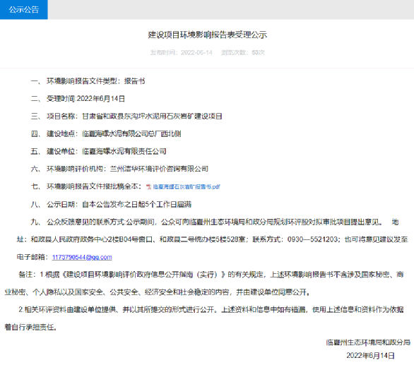 據(jù)水泥人網了解,2022年6月14日甘肅省臨夏州生態(tài)環(huán)境局和政分局發(fā)布《建設項目環(huán)境影響報告表受理公示》。公示建設項目為臨夏海螺水泥有限公司總廠西北側甘肅省和政縣東溝坪水泥用石灰?guī)r礦建設項目。