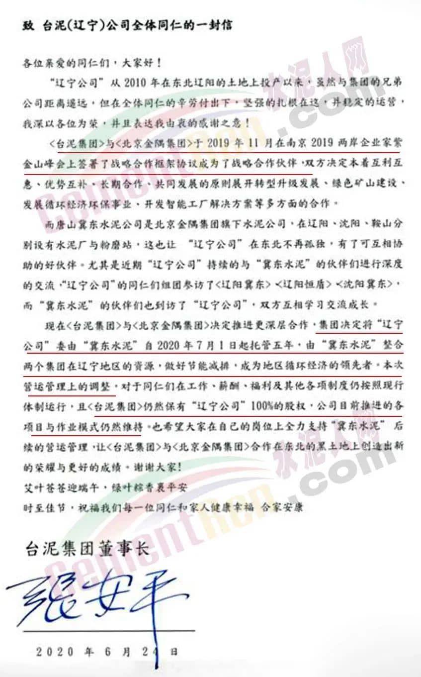據(jù)水泥人網(wǎng)此前報(bào)道,2020年6月臺(tái)泥集團(tuán)董事長(zhǎng)張安平先生在發(fā)給臺(tái)泥(遼寧)公司全體員工的一封公開信中稱:臺(tái)泥集團(tuán)與北京金隅集團(tuán)于2019年11月在“南京2019兩岸企業(yè)家紫金山峰會(huì)”上簽署了戰(zhàn)略合作框架協(xié)議,成為了戰(zhàn)略合作伙伴。