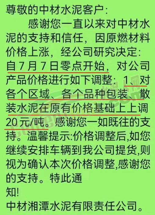 中材湘潭水泥有限責(zé)任公司通知,因原燃材料價(jià)格上漲,經(jīng)公司研究決定自7月7日零點(diǎn)開始,對(duì)各區(qū)域、各品牌包裝、散裝水泥在原價(jià)基礎(chǔ)上上調(diào)20元/噸。