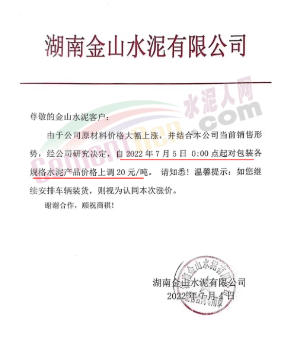 湖南金山水泥通知,由于公司原材料價(jià)格大幅上漲,結(jié)合公司當(dāng)前銷售形勢(shì),經(jīng)公司研究決定,自7月5日0時(shí)起對(duì)包裝各規(guī)格水泥產(chǎn)品價(jià)格上調(diào)20元/噸。
