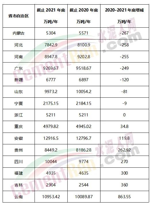 上述各省市自治區(qū)公布的2020和2021年水泥熟料生產(chǎn)線清單顯示,云南、吉林、福建、四川、貴州、安徽、重慶等省市自治區(qū)均有新增產(chǎn)能。