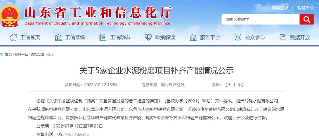 日前,山東工信廳發(fā)布《關(guān)于5家企業(yè)水泥粉磨項目補齊產(chǎn)能情況公示》稱,根據(jù)《關(guān)于印發(fā)堅決遏制“兩高”項目盲目發(fā)展的若干措施的通知》(魯政辦字〔2021〕98號)文件要求,招遠玲瓏水泥有限公司、茌平弘潤新型建材有限公司、山東魯珠水泥有限公司、東營市杰達新型建材有限公司、樂陵市俊華建材有限公司已建成或已開工建設的水泥粉磨違規(guī)存量項目,應按照項目立項時產(chǎn)能替代政策補齊產(chǎn)能。