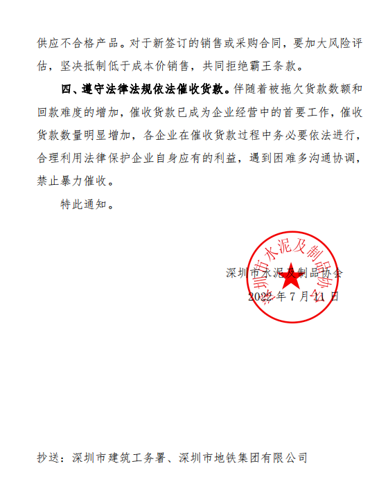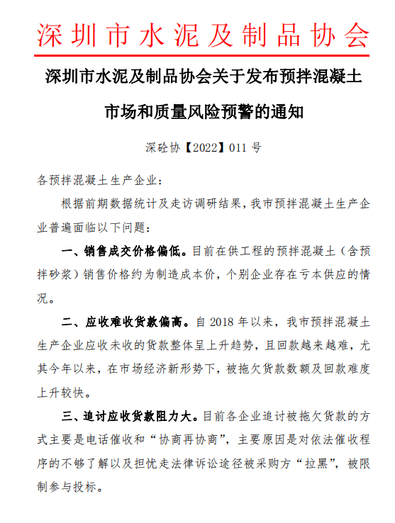 日前,深圳市水泥及制品協(xié)會關(guān)于發(fā)布預(yù)拌混凝土市場和質(zhì)量風(fēng)險預(yù)警的通知給各預(yù)拌混凝土生產(chǎn)企業(yè)稱,根據(jù)前期數(shù)據(jù)統(tǒng)計及走訪調(diào)研結(jié)果,深圳市預(yù)拌混凝土生產(chǎn)企業(yè)普遍面臨銷售成交價格偏低、應(yīng)收難收貨款偏高、追討應(yīng)收貨款阻力大、新中標(biāo)價格持續(xù)偏低等問題。