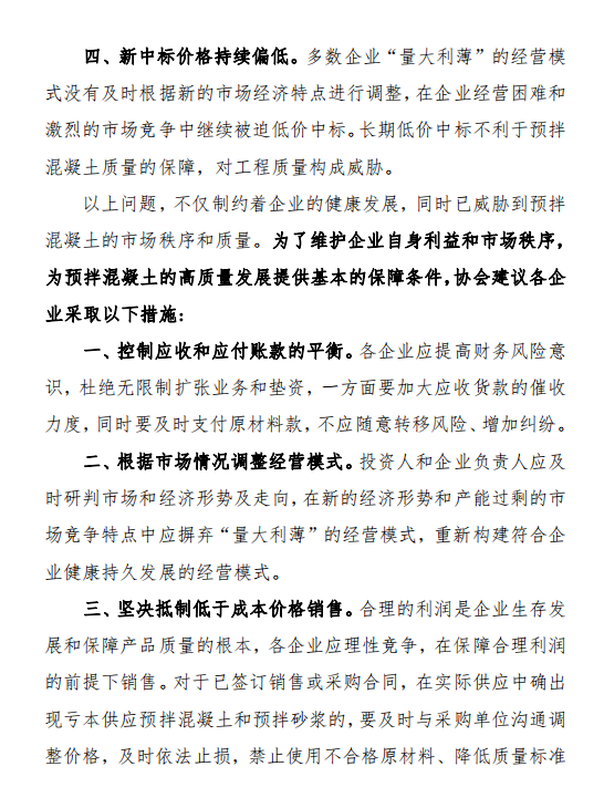 目前在供工程的預(yù)拌混凝土(含預(yù)拌砂漿)銷售價格約為制造成本價,個別企業(yè)存在虧本供應(yīng)的情況。