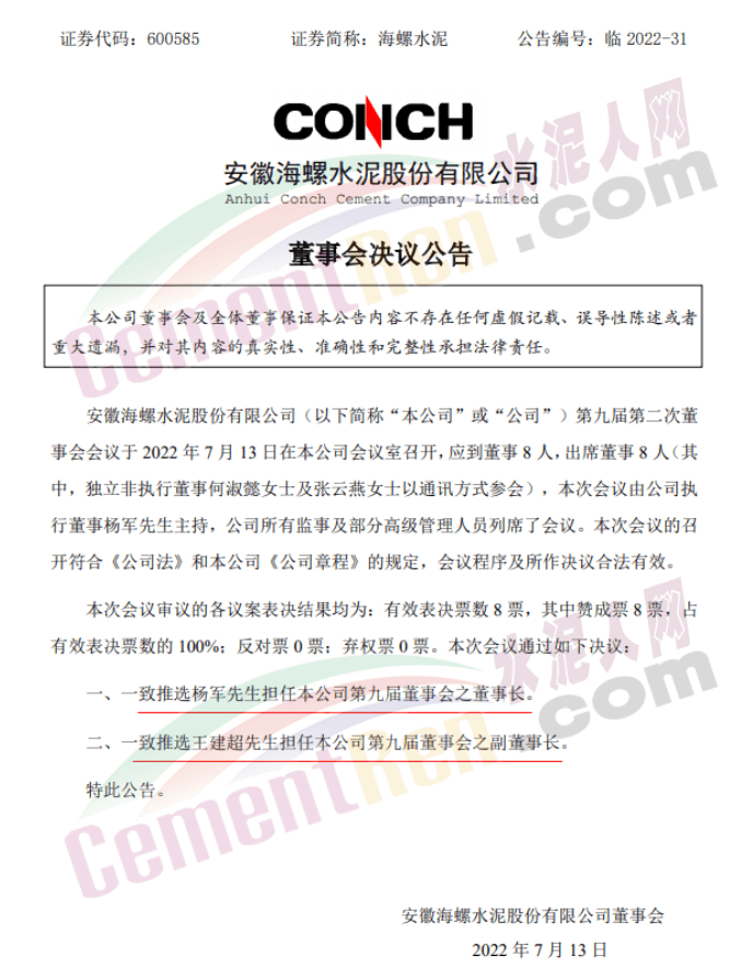 海螺水泥(600585)7月13日晚間公告,公司第九屆第二次董事會(huì)會(huì)議于當(dāng)日召開,會(huì)議一致推選楊軍擔(dān)任公司第九屆董事會(huì)之董事長;一致推選王建超擔(dān)任公司第九屆董事會(huì)之副董事長。