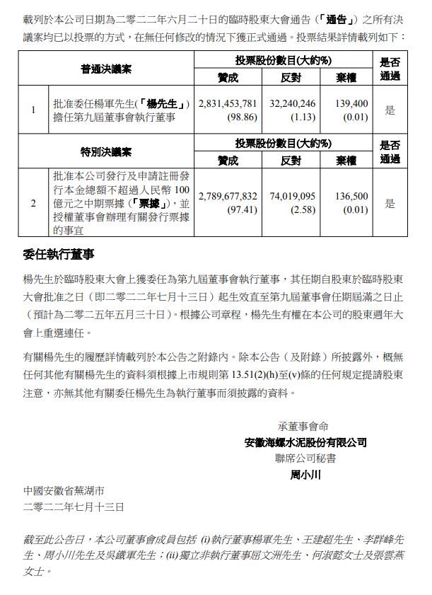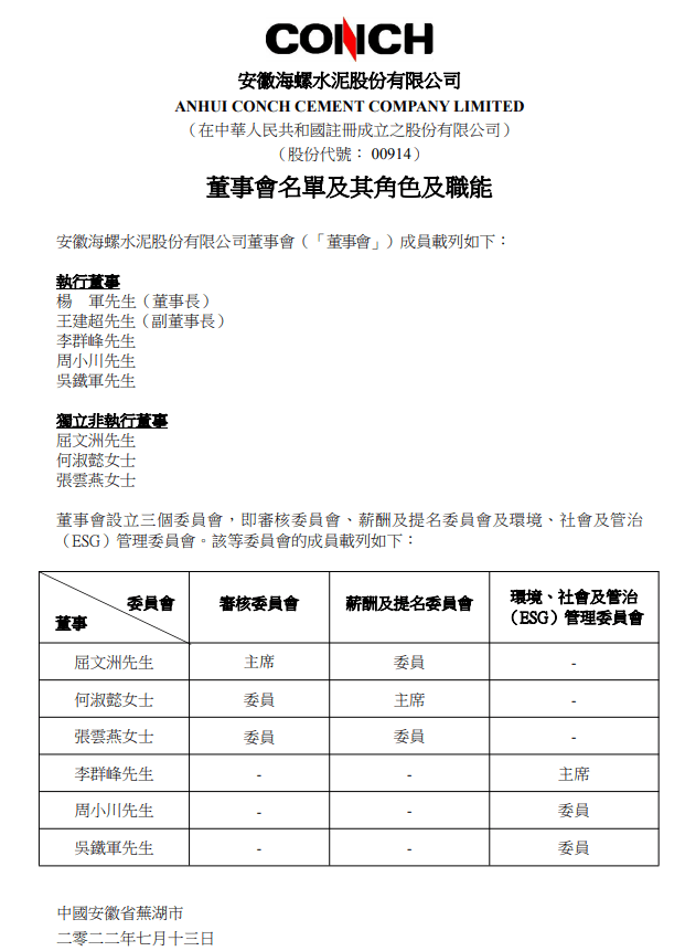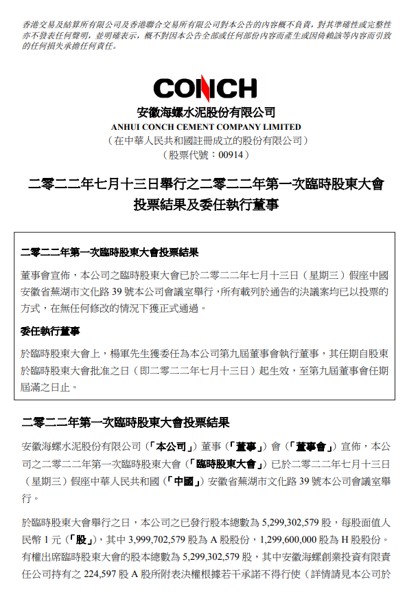 楊先生于二零二二年五月加入安徽海螺集團(tuán)有限責(zé)任公司(「海螺集團(tuán)」),現(xiàn)擔(dān)任海螺集團(tuán)黨委書記、董事長。