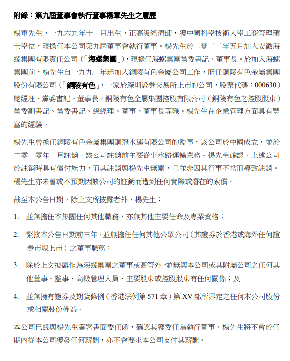 水泥人網(wǎng)注意到,海螺水泥另一則公告附錄中提到截至公告日,楊軍先生: