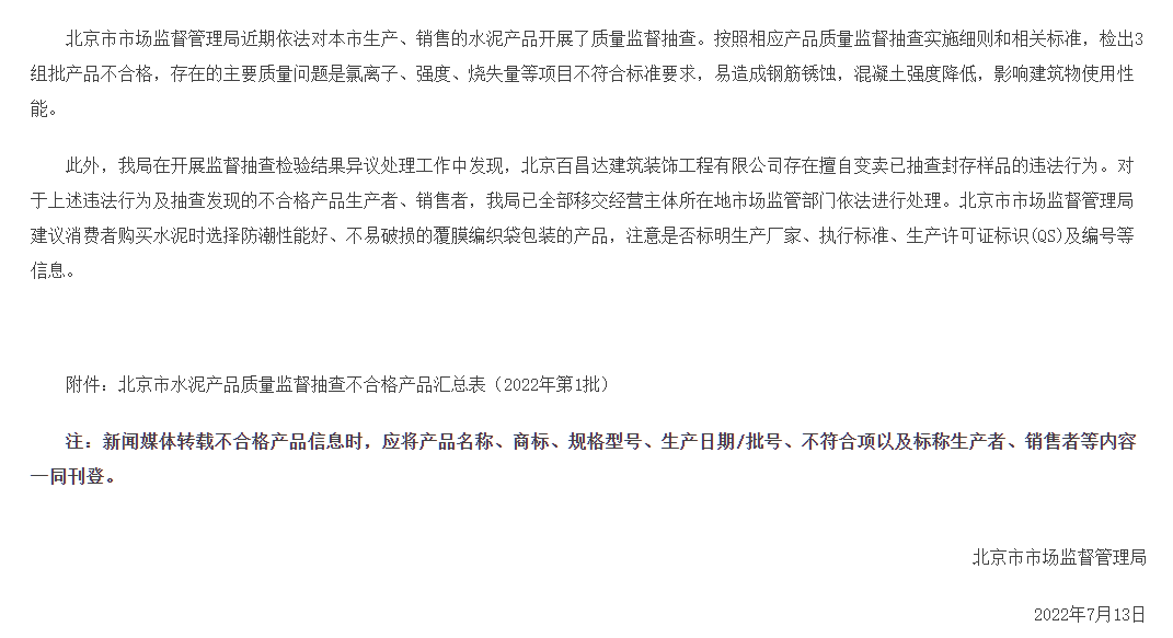 7月13日,北京市市場監(jiān)督管理局公布了《北京市水泥產(chǎn)品質(zhì)量監(jiān)督抽查結(jié)果公示(2022年第1批)》。