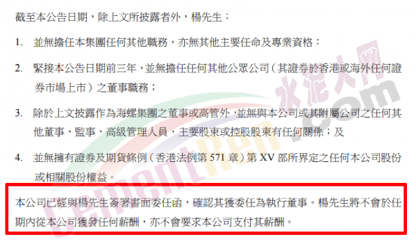 日前海螺水泥發(fā)布公告,董事會一致推選楊軍擔任第九屆董事會董事長。且截至公告日楊軍并無擔任集團任何其他職務(wù),亦無其他主要任命及專業(yè)資格。 且不擁有企業(yè)股份,也不從海螺水泥領(lǐng)工資,也不會要求海螺水泥發(fā)工資。
