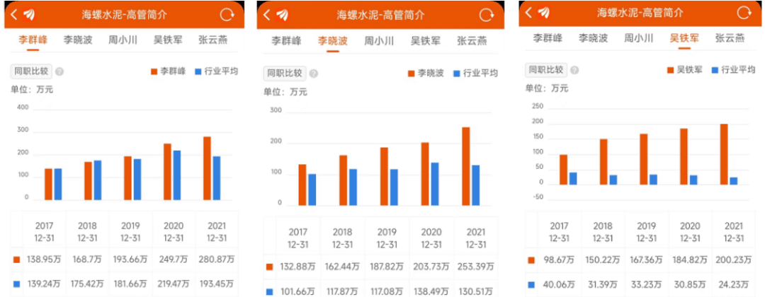 從海螺水泥上市公司公布的16位高管列表可見:海螺水泥總經(jīng)理李群峰年薪280.9萬元。副總經(jīng)理李曉波,總經(jīng)理助理吳鐵軍、虞水,職工監(jiān)事劉田田等5位上市公司高管年薪均在200萬以上。李群峰、李曉波、吳鐵軍三位高管年薪近五年薪資逐年上漲。