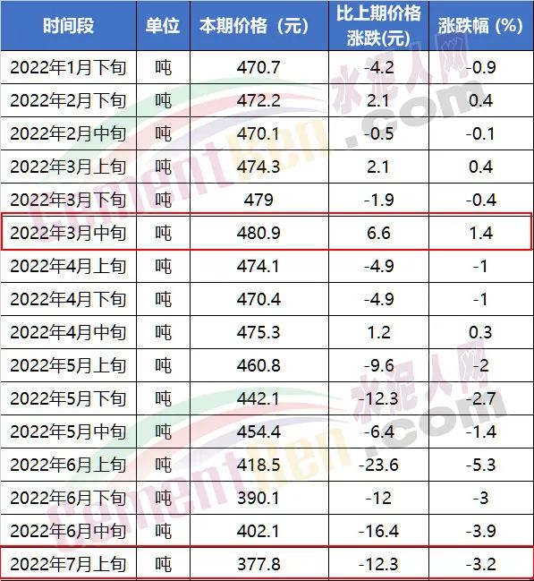 國家統(tǒng)計局流通領(lǐng)域價格信息顯示,P.O 42.5散裝水泥2022年3月中旬報480.9元/噸為上半年最高價,2022年7月上旬報377.8元/噸,為相對較低價,高價與低價相差100元/噸以上。