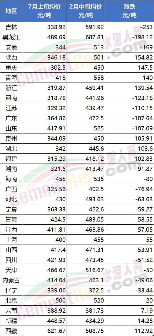從上述數(shù)據(jù)可見,自2022年春節(jié)以來,31個省市自治區(qū)中,除云南、新疆、西藏3個區(qū)域外,其余29個區(qū)域均處于下跌狀態(tài)。據(jù)水泥人網(wǎng)信息中心重點監(jiān)控的600多家水泥企業(yè)P.O42.5散裝水泥報價,7月初,重慶、安徽、河南、吉林、浙江、廣西、貴州、遼寧、福建、湖南等10多個省市地區(qū)絕大多數(shù)企業(yè)報價已跌至300元/噸以下。