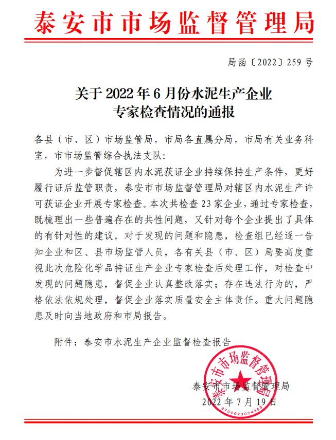 泰安市關于2022年6月份水泥生產(chǎn)企業(yè)專家檢查情況的通報