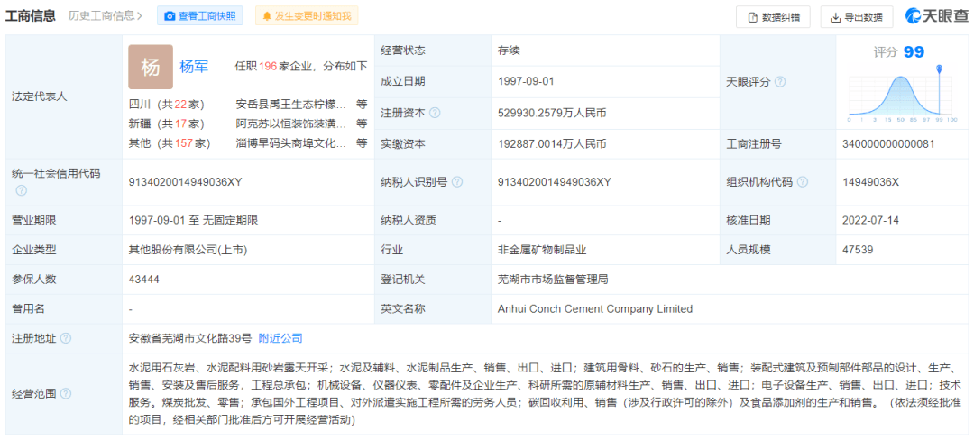 天眼查數(shù)據(jù)顯示:7月14日,安徽海螺水泥股份有限公司(以下簡(jiǎn)稱“海螺水泥”)法定代表人由王誠變更為楊軍。