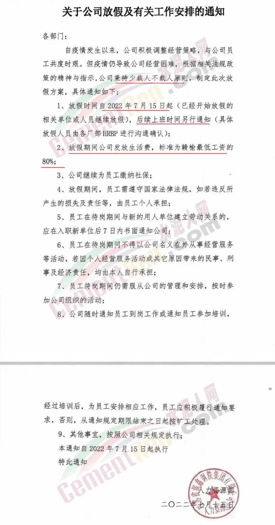 江蘇鑌鑫鋼鐵發(fā)放假通知稱,自2022年7月15日起放假,后續(xù)上班時間另行通知;放假期間公司發(fā)放生活費,標(biāo)準(zhǔn)為贛榆最低工資的80%……
