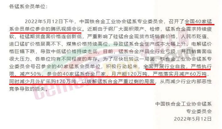 據(jù)了解,早在5月中旬,中國鐵合金工業(yè)協(xié)會錳系專業(yè)委員會就召開了全國40家錳系會員單位參會的騰訊視頻會議。