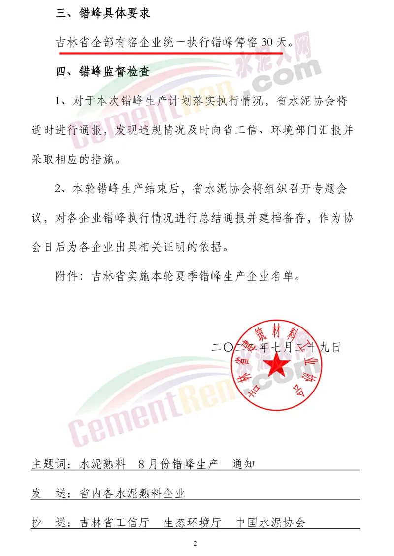 吉林省建筑材料工業(yè)協(xié)會吉林省水泥協(xié)會發(fā)布《關于吉林省水泥熟料企業(yè)開展2022年8月份夏季錯峰生產(chǎn)的通知)給吉林省水泥熟料企業(yè)要求實施2022年8月份夏季錯峰生產(chǎn)。